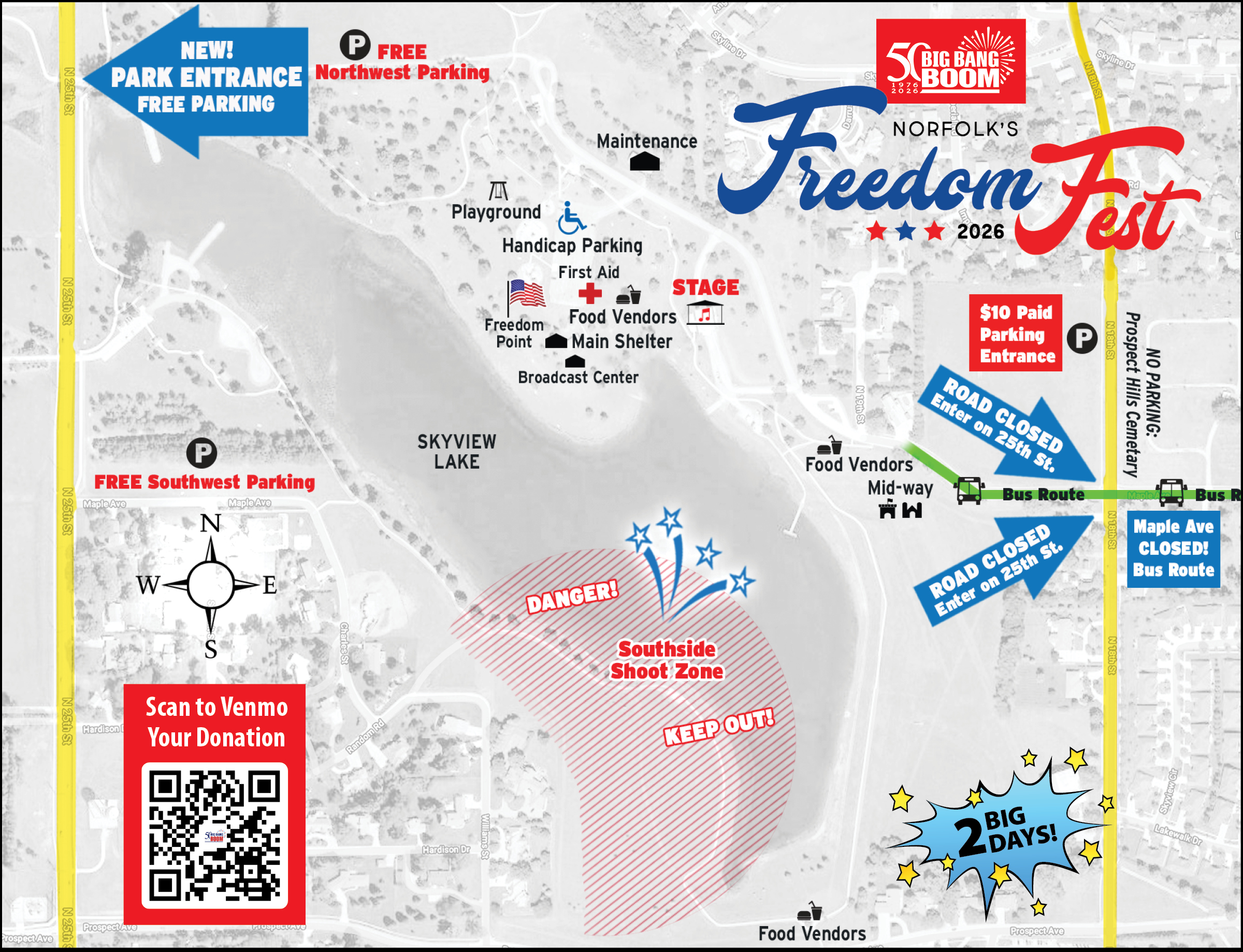 Paid Parking — will be in the field at the northwest corner of Maple and 18th street with entrance and exit on 18th street. Open after 6:00 p.m. on Saturday, $10 per car. BigBang Boom staff will be on hand to direct you where to park. The attendants will be on hand after the show to direct you out of the parking lot. Please exit to the north to Benjamin Ave.